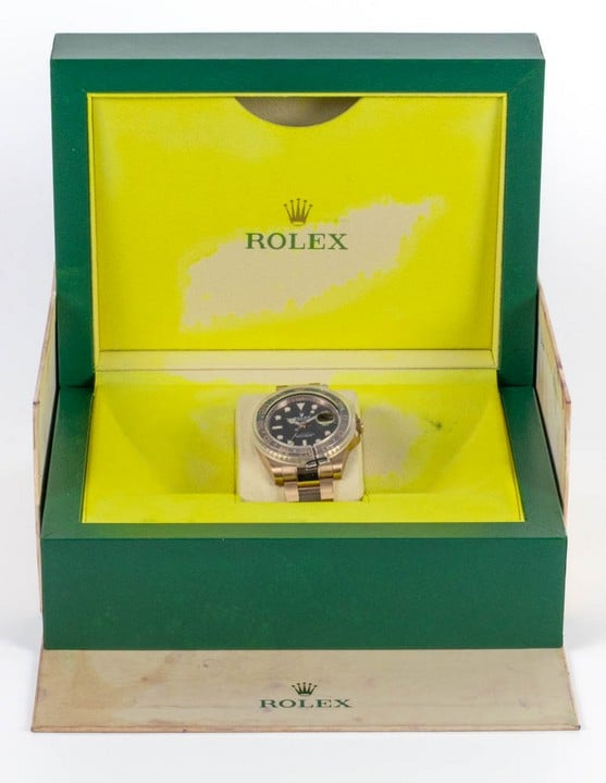 Case: 18ct Rose Gold Case with 18ct Rose Gold Bi-Directional Bezel, Black Dial with GMT Function and Date Aperture
