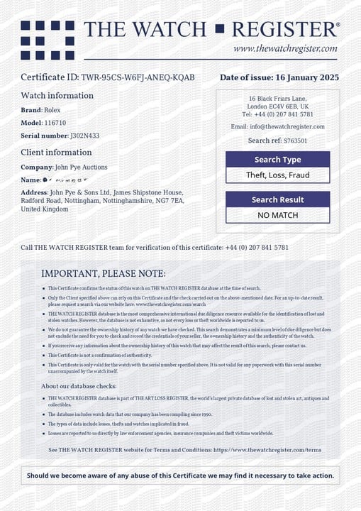 Attending an in-person viewing is highly recommended. Although all lots are handled and checked by our professionals, identifying any after-market, non-original or foreign parts are the responsibility of the purchaser. Third party authenticators are welcome to attend, please contact us to arrange a private viewing.