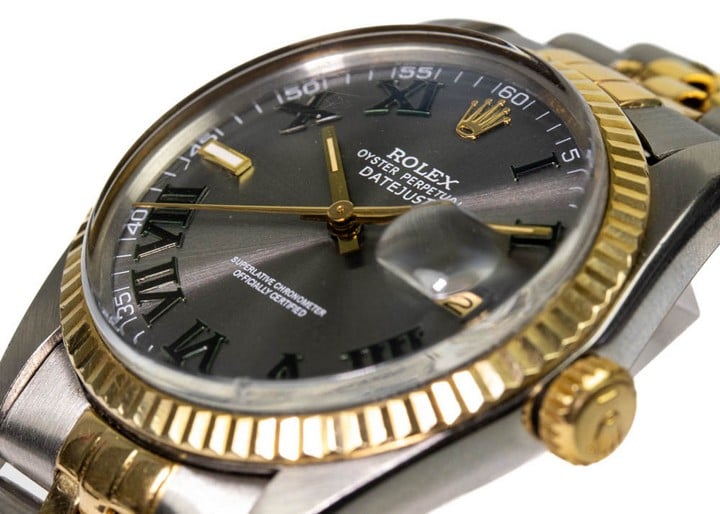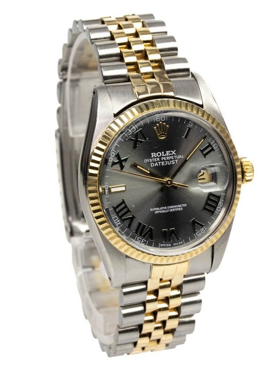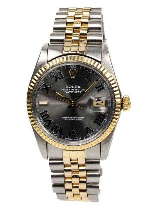 Case: Stainless Steel Case with 18ct Yellow Gold Fluted Bezel, Wimbledon Roman Dial and Date Apert