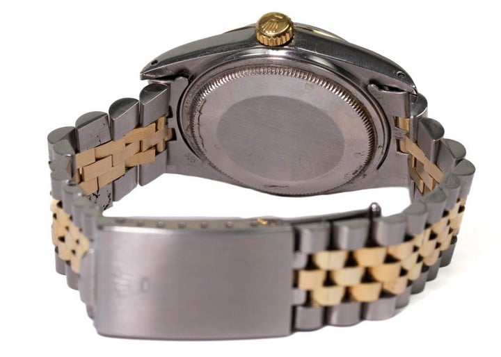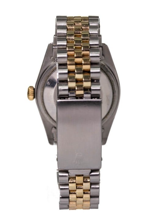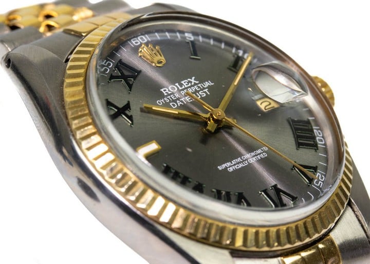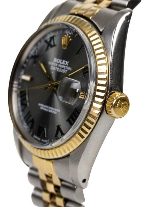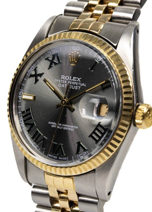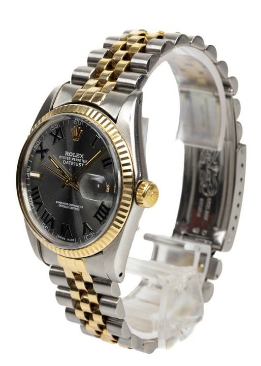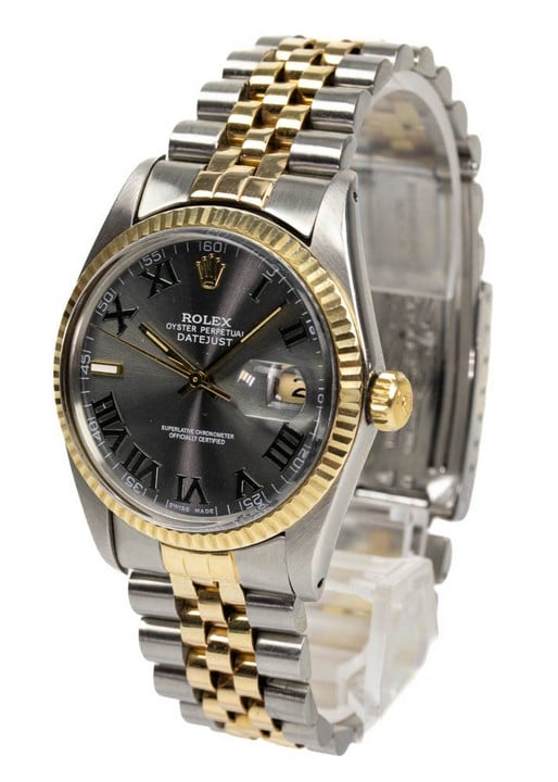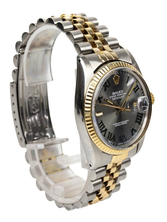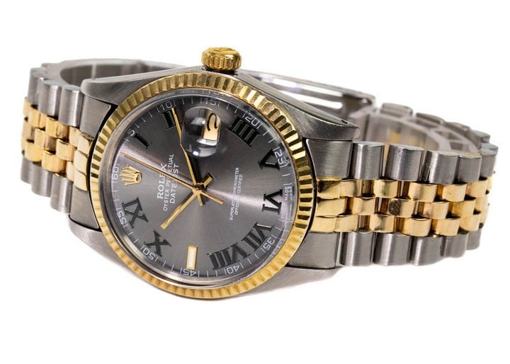 Case: Stainless Steel Case with 18ct Yellow Gold Fluted Bezel, Wimbledon Roman Dial and Date Aperture