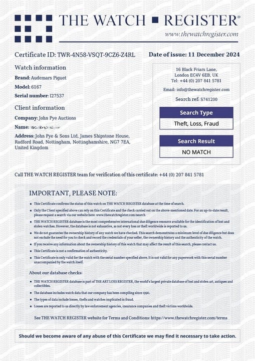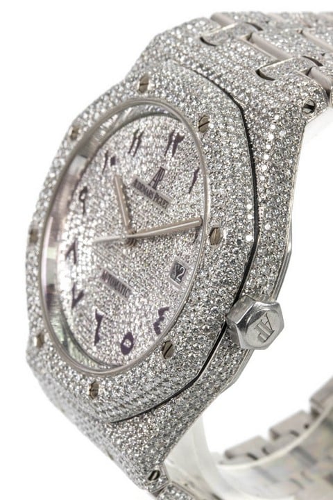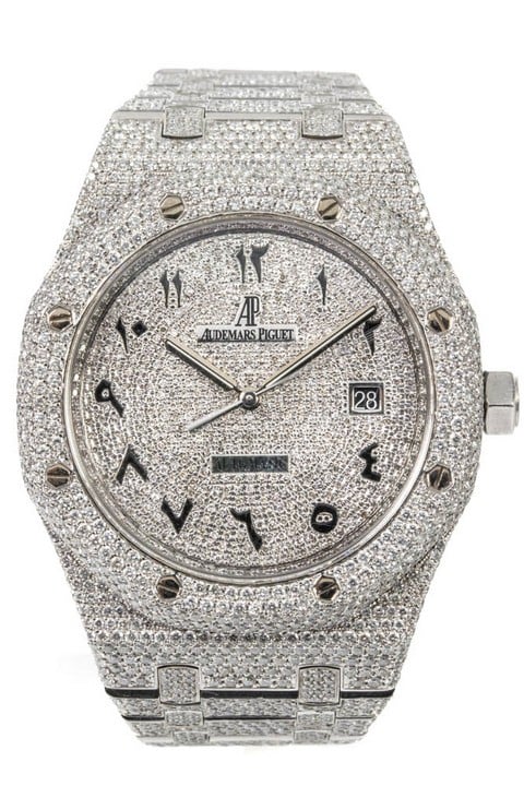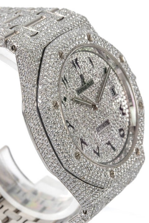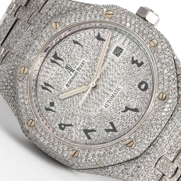 Audemars Piguet Royal Oak Automatic Watch Ref: Unknown Year: Unknown Size: 41mm Movement: Automatic, AP3120 Case: Stainless Steel After Market Diamond Case with Stainless Steel After Market Diamond Fixed Bezel, After Market Diamond Dial with Date Aperture Bracelet: Stainless Steel After Market Diamond Bracelet Brief Condition Report: Time can be set, signs of wear to the case and bracelet Box: No Papers: No Auction Guide: £8,000-£10,000 (VAT Only Payable on Buyers Premium) (MPSB25249172) Attending an in-person viewing is highly recommended. Although all lots are handled and checked by our professionals, identifying any after-market, non-original or foreign parts are the responsibility of the purchaser. Third party authenticators are welcome to attend, please contact us to arrange a private viewing.