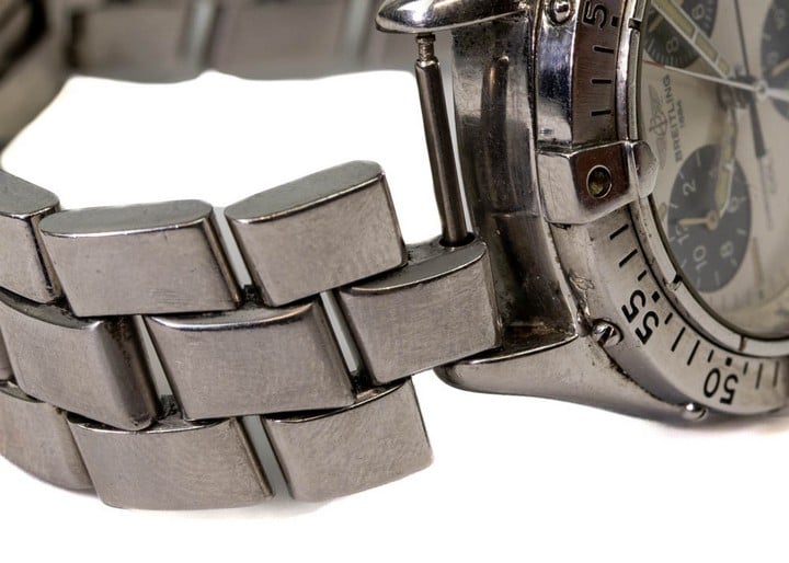 Brief Condition Report: Not currently running, missing end link, bezel pip, potential water damage to dial.